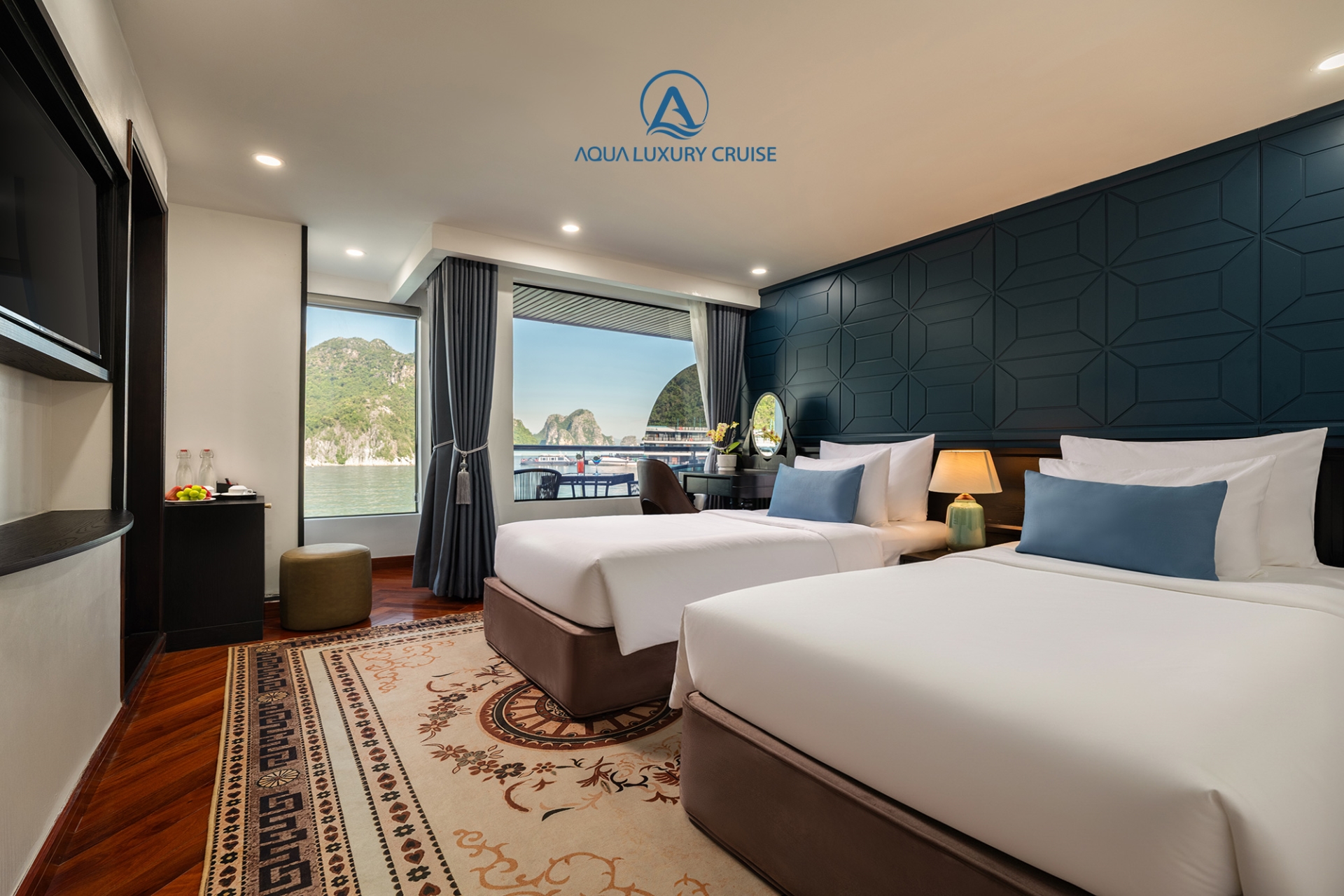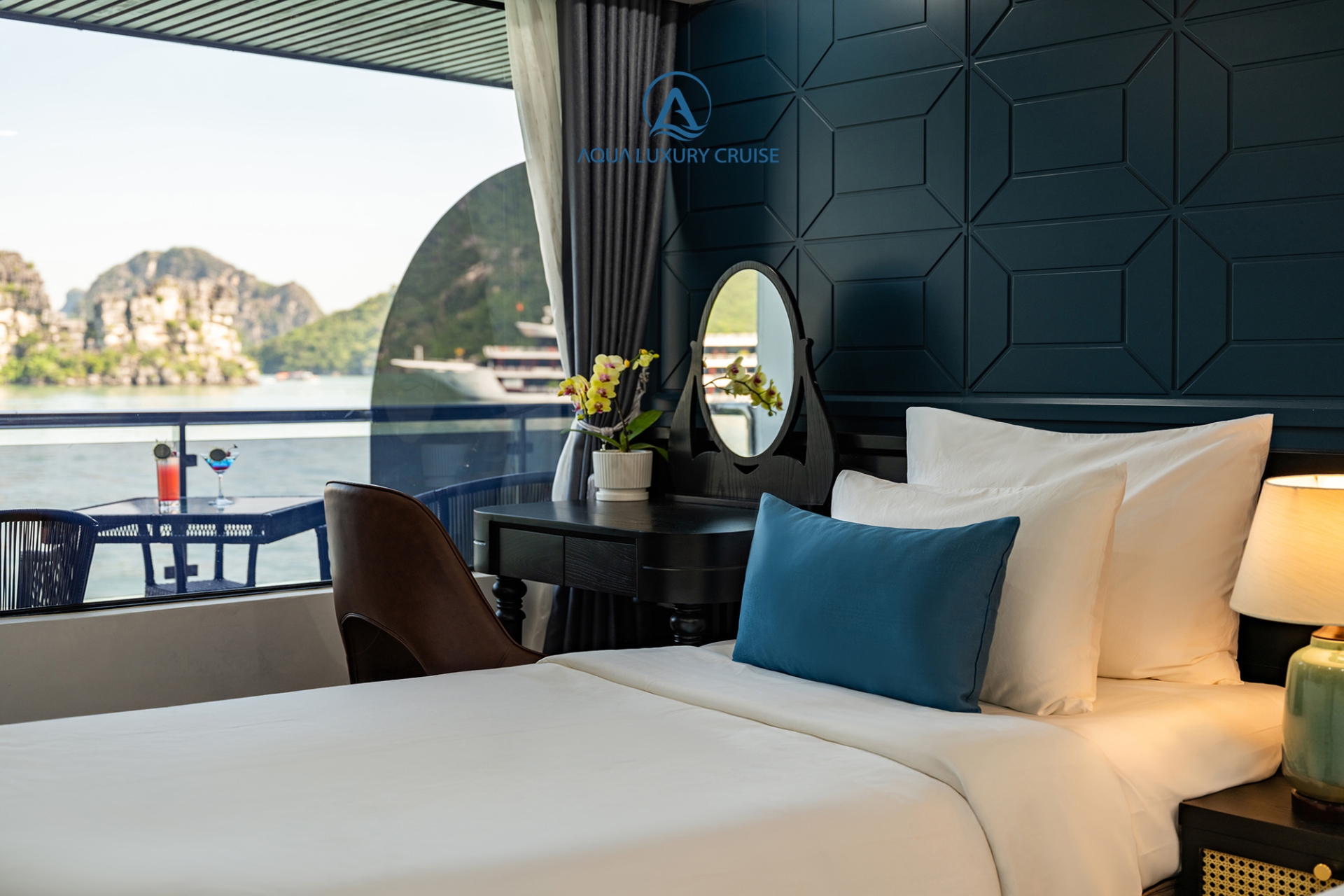 Senior Suite Balcony - Aqua Luxury Cruise is located on the 2nd floor, with a total of 12 spacious rooms, each with an area of 35m², providing a luxurious and comfortable resort space. The rooms are exquisitely designed with high-class bathtubs, creating ideal conditions for relaxation after a day of experience. Private balconies facing the bay, allowing visitors to fully enjoy the majestic beauty and fresh air of Ha Long Bay. The room interior is fully equipped with modern amenities, ensuring a convenient and classy resort experience, suitable for those looking for peace and luxury throughout the journey.