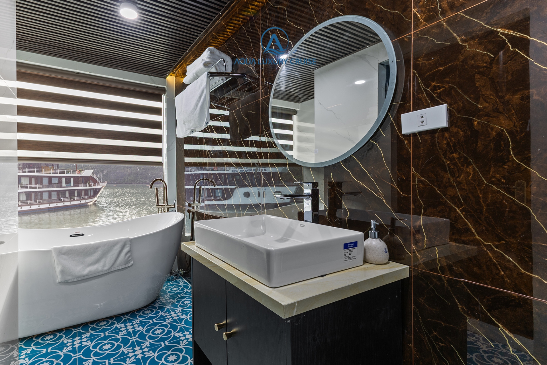 Phòng Honeymoon Suite Terrace trên du thuyền Aqua Luxury nằm tại tầng 2, là hạng phòng cao cấp với diện tích rộng lên đến 45m², mang đến không gian nghỉ dưỡng đẳng cấp và thoáng đãng. Phòng được trang bị bồn tắm nằm sang trọng, nơi du khách có thể thư giãn và tận hưởng khung cảnh thiên nhiên tuyệt mỹ với tầm nhìn hướng vịnh. Ban công riêng mở ra không gian thoáng đãng, lý tưởng để đón ánh bình minh hay ngắm hoàng hôn trên vịnh. Nội thất trong phòng được thiết kế hiện đại và tiện nghi, từ giường ngủ êm ái đến các trang thiết bị cao cấp, mang lại trải nghiệm nghỉ dưỡng hoàn hảo cho những ai tìm kiếm sự thoải mái và tinh tế trên hành trình khám phá Vịnh Hạ Long.